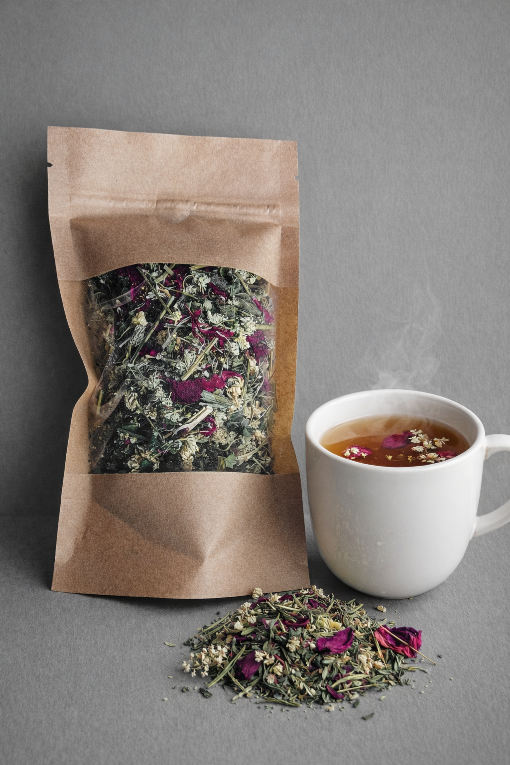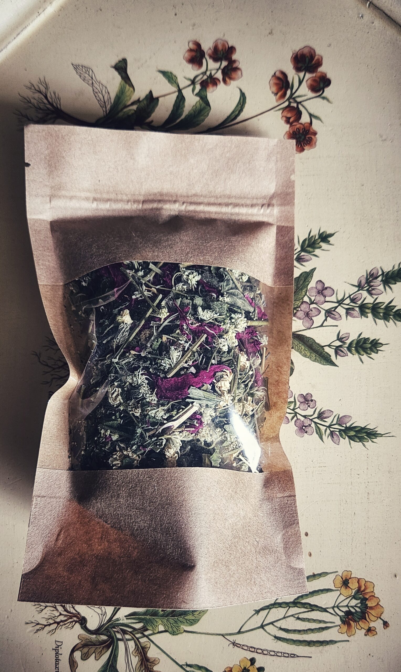Mišinio sudėtis: Vaistinis skaistenis, laukinė morka (žiedai), didžioji dilgėlė, pipirmėtė, bijūnų žiedlapiai (lot. Tanacetum parthenium, Daucus carota, Urtica dioica, Mentha Piperita, Paeonija spp.)